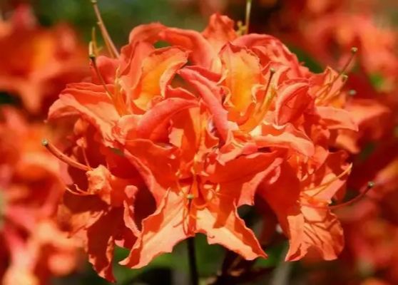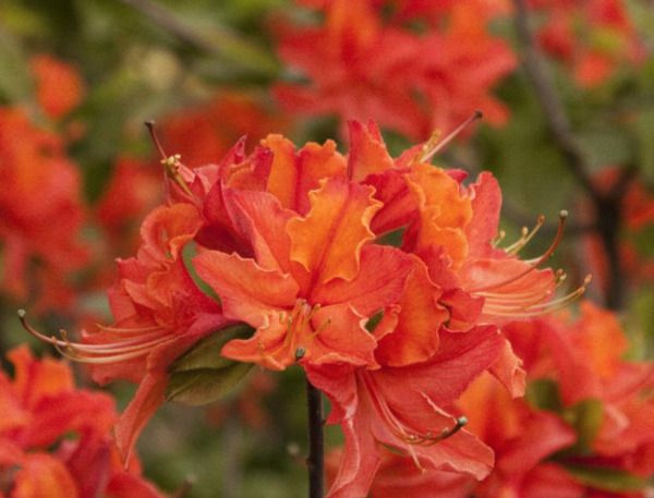 У азалії Мандарин Лайтс листя еліптичне, на кінці загострене, з клиноподібною основою, плоске, до 10 см завдовжки, блискуче, оливково-зелене, а восени темно-бордове. Квітки вузькі, дзвонові, ароматні, в діаметрі до 8 см. Гострокінцеві гофровані пелюстки переливаються оранжево-червоно-жовтими відтінками, змінюючи тон залежно від освітлення. На центральному пелюстці чітко видно яскраво помаранчеву плямку. Суцвіття кулясті, з 7-10 квіток. Цвіте рясно з кінця травня – на початку червня.