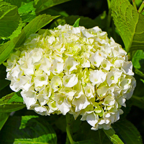 Гортензія крупнолиста 'Ice Girl' - елегантний сорт з кулястими дуже густими суцвіттями. Він виростає приблизно до 120 см у висоту і приблизно такого ж діаметру. З червня по жовтень пучки темно-зеленого листя прикрашають красиві пишні парасольки. Великі квіти з витончено зазубреними краями пелюсток спочатку зеленуваті, потім кремово-жовті, а наприкінці набувають чистого білосніжного кольору. Чагарник чудово освітить злегка затінені ділянки саду. Завдяки невеликому розміру він також стане чудовою прикрасою горщиків і ємностей.