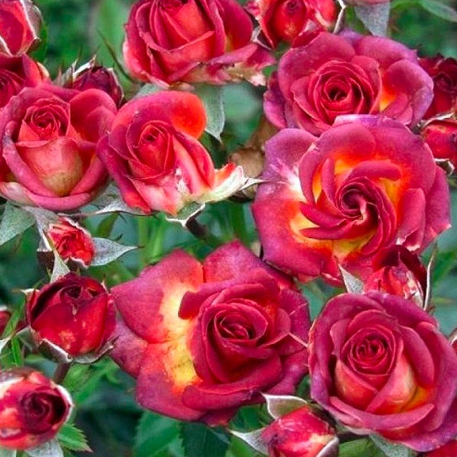 Сорт характеризується дуже інтенсивним цвітінням, кущ практично весь усипаний червоними з коричневим забарвленням квітками і кремовими не звичайними плямами.
