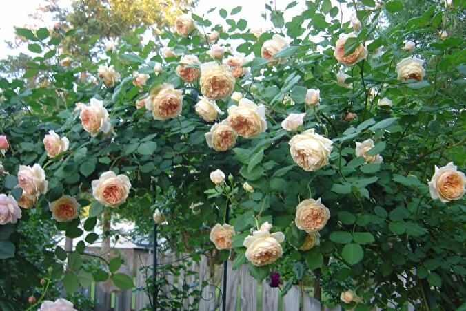 Троянда Воллертон олд Холл. Плетиста форма. Одна з найзапашніших англійських троянд із сильним, характерним ароматом мирри. Квітки махрові, спочатку кольору вершкового масла, потім ніжного кремового кольору. Навіть коли квіти повністю відкриті, вони зберігають свою красиву округлу чашоподібну форму.