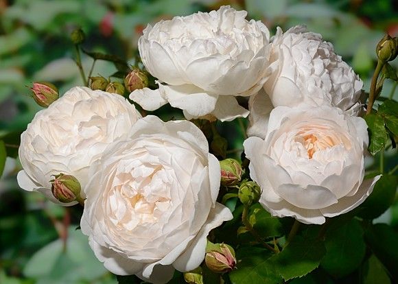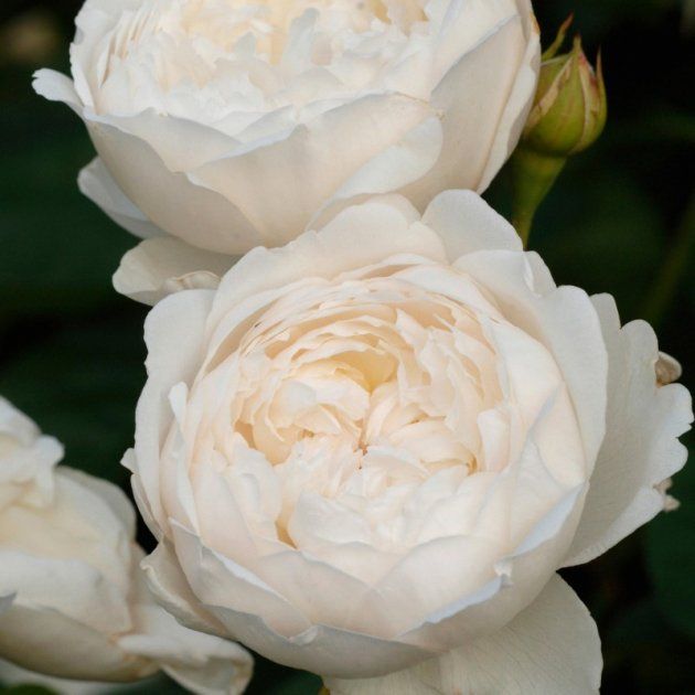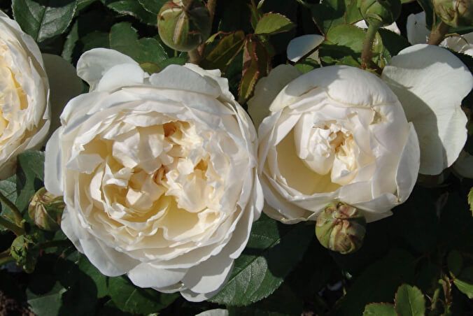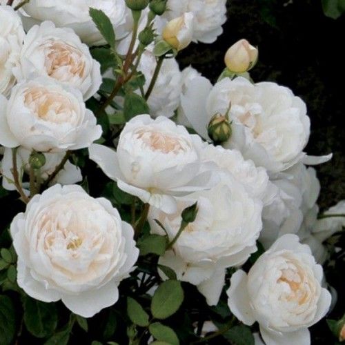 Glamis Castle- вражає чистотою білого кольору пелюсток троянд. Характеризується пишним і рясним цвітінням, ніжні чашовидні густомахрові квіти старомодної форми, відчувається солодкий аромат з нотками мірри. Троянда зацвітає однією з перших, і цвіте майже безперервно, постійно випускаючи нові бутони. Кущ міцний, компактний, округлої форми. Кущ розростається з віком, кращі свої декоративні якості проявляє при посадці в напів тіні. Сорт висаджується на передньому плані клумб, прекрасно виглядає при висадці у великих горщиках для декорації патіо-двориків. Кущ невеликий, висотою 90 см і діаметром 75 см з численними тонкими пагонами, які безперервно радують дуже великою кількістю квіток.