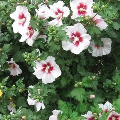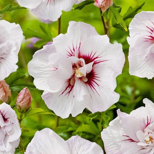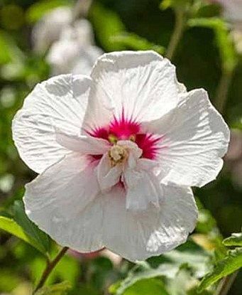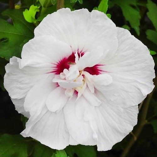 Гібіскус деревовидний "China Chiffon"відрізняється неймовірною красою, невибагливістю і витривалістю. Дуже ефектний і красивий сорт з махровими білосніжними квітами із невеликим бордовим червоним вічком в центрі, яке розходиться бордовими променями по всіх пелюстках. Листя зелене. Особливих вимог до грунту немає. Морозостійкий. Він вигідно виглядатиме на клумбах, прибудинкових ділянках, уздовж бордюрів і не тільки, в якості живоплоту, в одиночних і змішаних посадках.