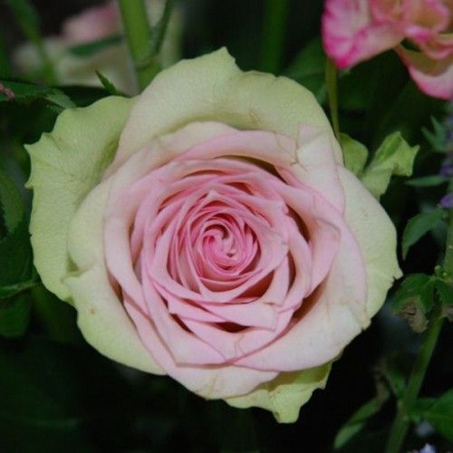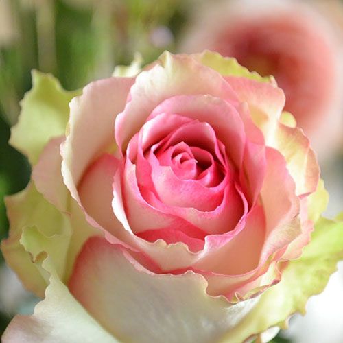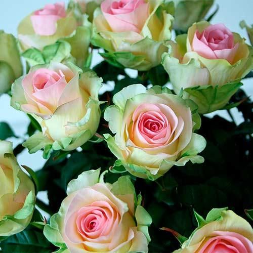 Троянда чайно-гібридна Дансінг Квін (Dancing Queen) – це елегантний сорт з рожево-зеленими квітками. Високі бутони витончені, діаметр 9-13 см, махрові до 25-30 пелюсток, бездоганної форми, краї пелюсток – зі злегка хвилястою зеленою каймою. Шипів мало. Запах приємний, виражений слабо. Dancing Queen рано починає цвісти і йде під сніг з бутонами. Кущі досить високі, неширокі, в ландшафтному дизайні рекомендуємо висаджувати по 3-5 кущів поруч. Пелюстки – щільні, ніби порцелянові, відмінно витримують дощ і спеку. Чайно-гібридні троянди здатні дати до 10 бутонів одночасно. Сорт вирощують і для зрізу на букети. Квітки залишаються гарними дуже довго.