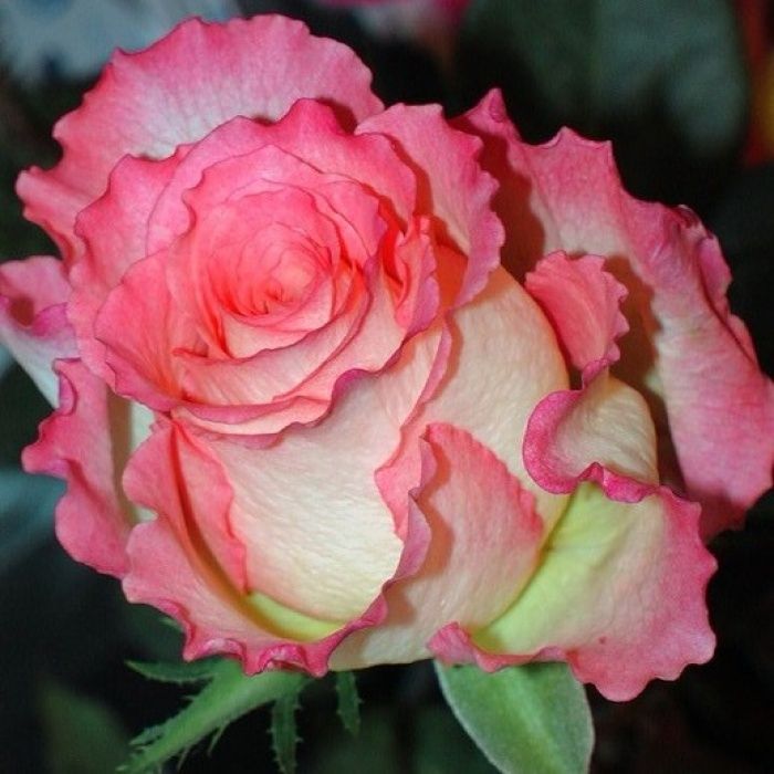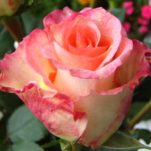 Сорт Дует (Kordes Германія, 2000) - бокаловидна квітка чайно-гібридної троянди відрізняється насиченим перламутровим кольором з більш темними краями пелюсток. На кінцях гофрованих пелюсток тонка рожева облямівка. Розпускається троянда плавно, поступово розкриваючи ніжні кремово-білі пелюстки з легким рожевим або яскраво-персиковим нальотом на кінчиках. Такий чуттєвий і ніжний колір троянди виділяє сорт з багатьох йому подібних. Велика до 10 см квітка троянди, володіє тонким ароматом фіалки. Кущі троянди Дует щільні, висотою до 100 см, компактні. Незважаючи на крихкість, сорт добре переносить морози, і довгий час після зрізки зберігає привабливий зовнішній вигляд.Завдяки рясному і тривалому цвітінню троянда Duett відмінно підходить для озеленення садових ділянок, клумб і міксбордерів. Для недосвідченого садівника ця троянда буде кращим першим другом на довгі роки.