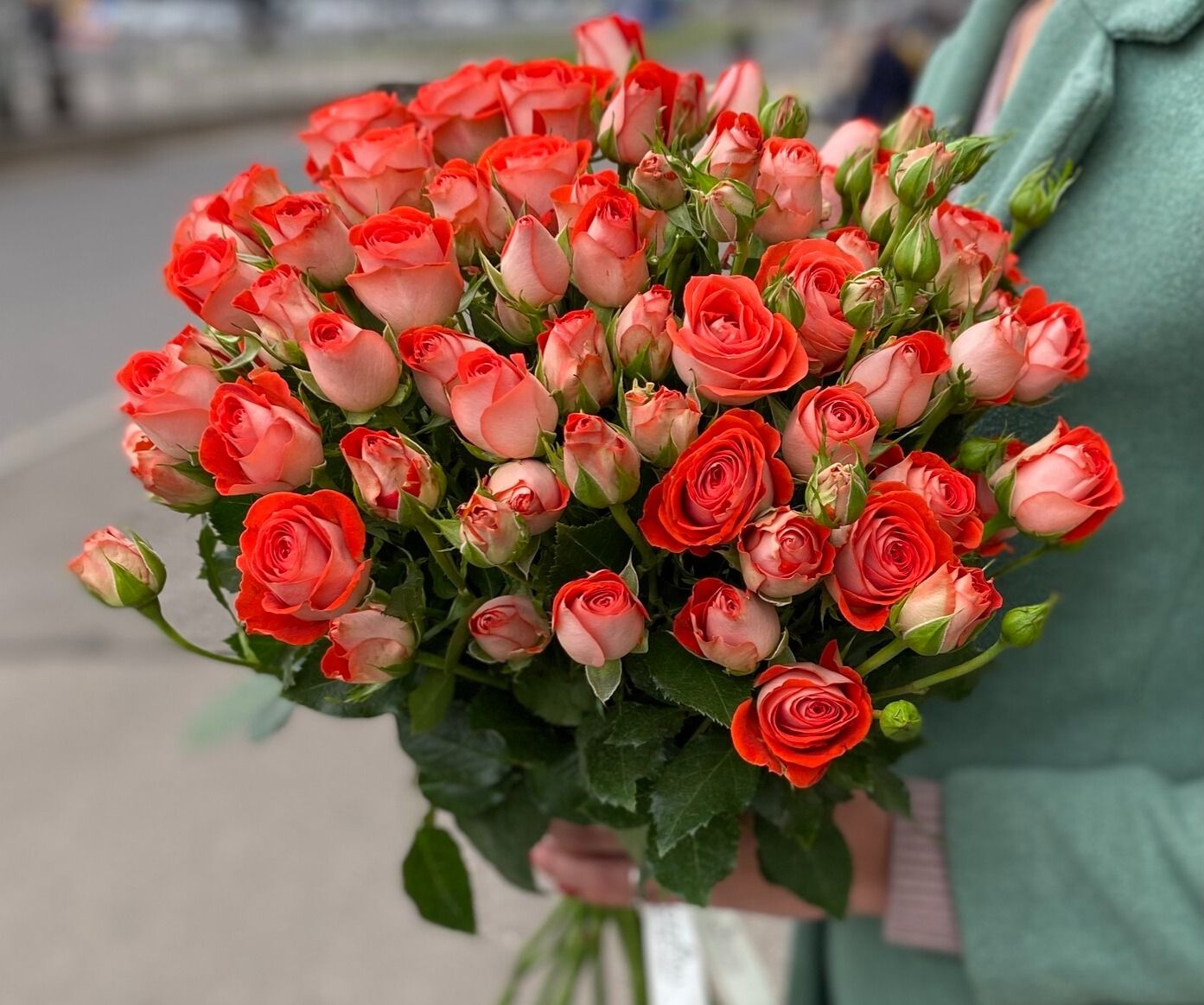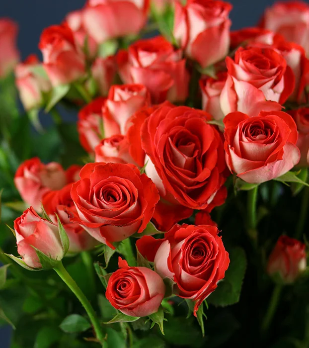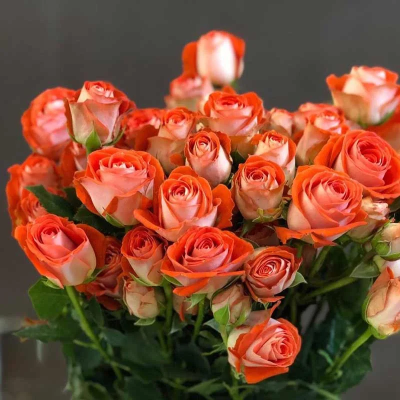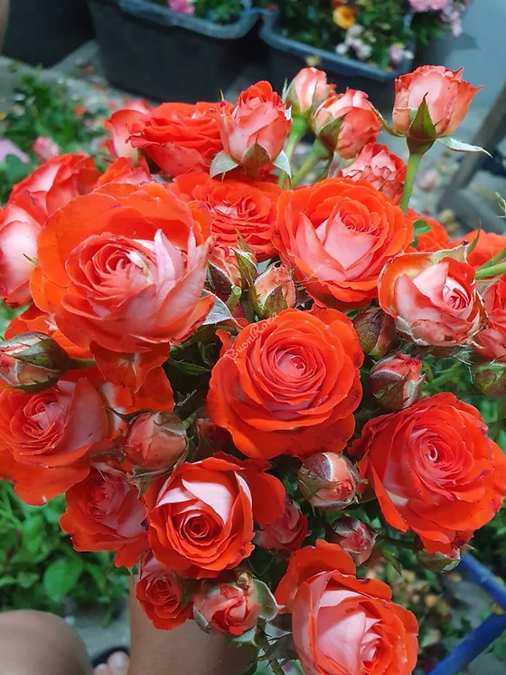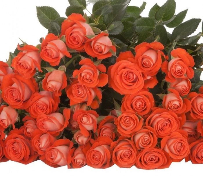 Напрочуд яскраво-червоні спрей троянди з помаранчовим відливом.