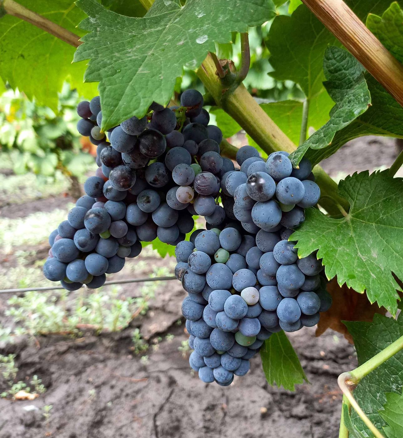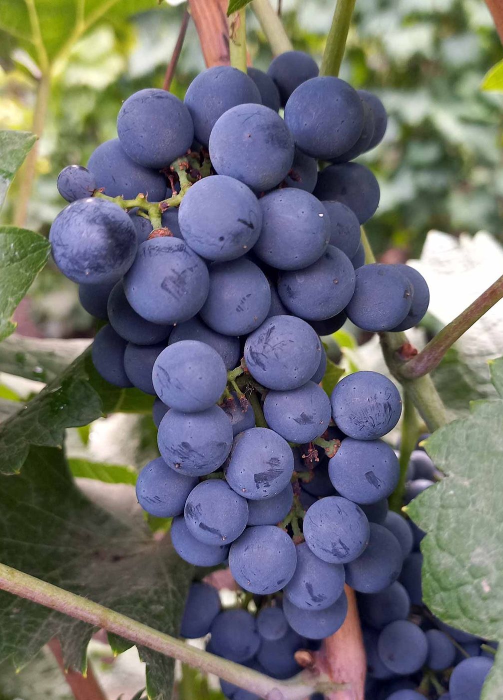 Грона конічної форми, середніх розмірів, досягають у вазі 150 грамів, з середньою щільністю. Довжина кожного грона приблизно 15 сантиметрів, а ширина сягає 8 сантиметрів. Ягоди округлої форми, пофарбовані в насичений фіолетовий колір з густим пруіновім нальотом, середніх розмірів, досягають близько 1,5 сантиметра в діаметрі. Шкірочка досить товста. М'якоть соковита і трохи слизувата. Цукристість становить 19-21%, кислотність – 5-6 г/л. Сорт володіє гармонійним смаком з нотками чорної смородини, тютюну, сухої трави і зеленого перцю.