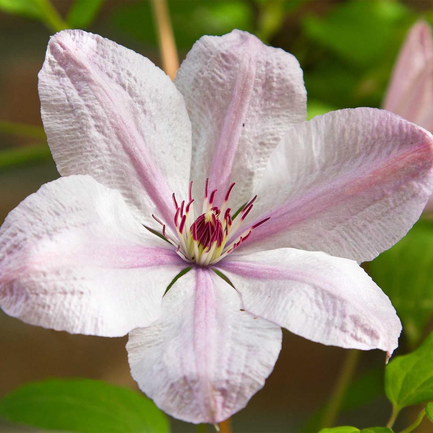 Клематис Надія – декоративна квітуча ліана з великою силою росту, рослина виростає до 2.5 м заввишки. Привертає увагу великими до 16 см квітками, що складаються з 6 пелюсток (чашолистків), ніжно-рожевого забарвлення з темнішою смугою в центрі, жовтою тичинкою. Цвітіння тривале повторне, перше у травні - червні найбільше, друга хвиля з першої половини серпня, відбувається прирості поточного року. Сорт Клематису Надія відрізняється високою стійкістю до зовнішніх кліматичних факторів. Посадка краща на сонячних ділянках, добре ростуть на легких, родючих, зволожених ґрунтах.