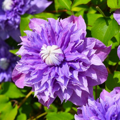Клематис "Floral dance" - це неймовірне створення природи та майстерності селекціонерів, що має пишні завжди махрові квітки. Складаються вони з кількох рядів еліптичних чашолистків, хитромудрих, вигнутих, ніби вирує море. Всього на одній квітці 35 чашолистків. Квітка клематису середнього розміру, в діаметрі досягає 7 см максимум. Колір чашолистків глибокий фіолетовий з пурпурною прожилкою, зворотний бік пелюсток сріблясто-сіра. Середина квітки має безліч кремово-зелених ниток з жовтими пильовиками. Клематис Floral Dance цвіте у 2 хвилі, перша настає у червні і триває після завершення липня, а друга вже настає з приходом осені, у вересні