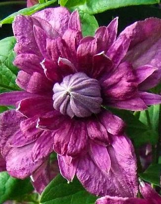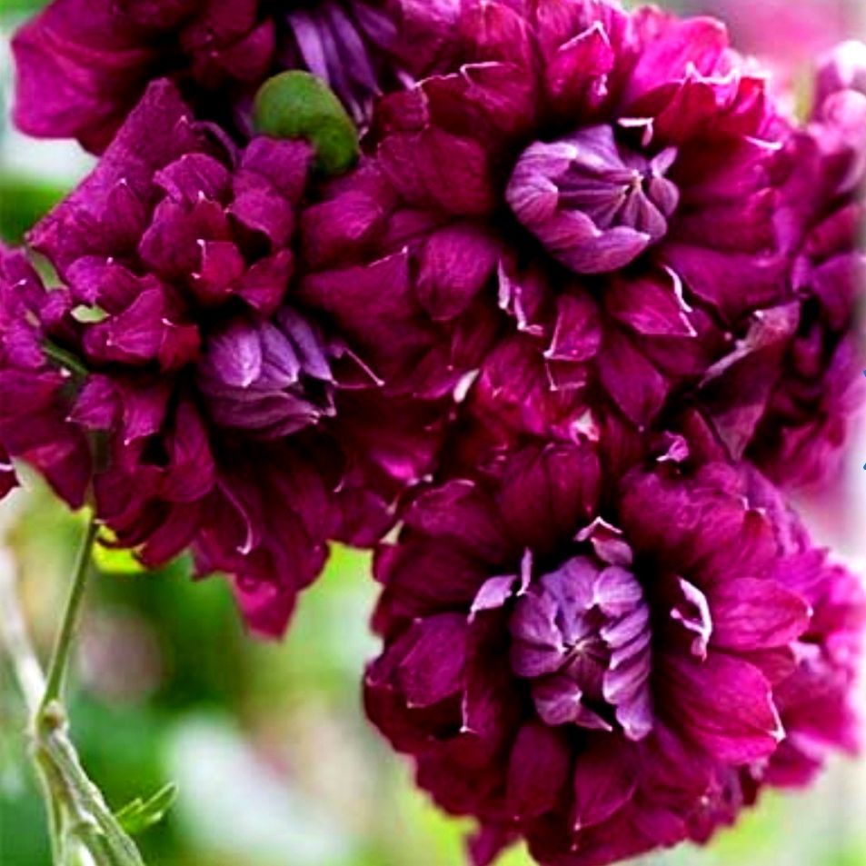 Клематис Purpurea Plena Elegans "Пурпуреа Плена Елеганс" розміри квіток невеликі, 5-8 см. На одній пагоні їх може бути до 100 шт. Квіти махрові, об'ємні, складаються з безлічі шарів пелюсток, закручених до зовнішнього краю. Забарвлення насичене бордове. Зовнішня сторона пелюстки світліша, ніж внутрішня. Ліана зростає 2-3м.