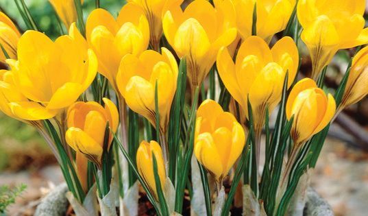Крокус великоквітковий Yellow- це один із пізноквітучих крокусів. Цей сорт зачаровує елегантними квітами! Кожна бульбоцибулина утворює кілька золотаво-жовтих квіток із блиском. Вони відкриваються в сонячну погоду і закриваються в дощову та вночі. Форма квіток – чашоподібна. Рильця – жовто-жовтогарячого кольору.