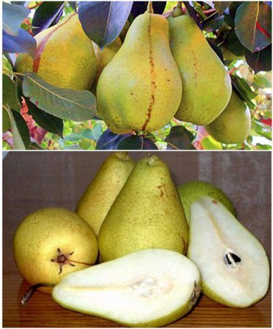 - розмір плодів: груші вагою від 250 до 400 г, шкірка гладка і досить щільна, в період дозрівання стає жовтого кольору, є рожевий рум’янець на боках і розсип темних крапок;