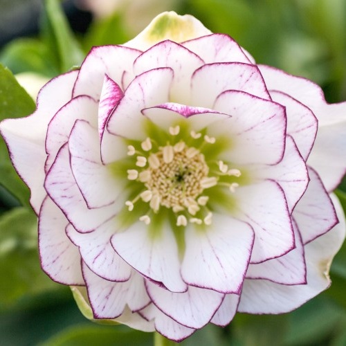 Морозник Дабл Вайт Пурпл Едже (Double White Purple Edge). Декоративна рослина, яка втішає своєю красою вже наприкінці зими – це не фантазія садівника, а реальна багаторічна культура. За своєю привабливістю вона дивовижна так само, як і зі своєї історії. Відомо, скільки років живе морозник у саду на одному місці – 10 років та більше. Рослина буде краще розвиватися, якщо поселити її в півтіні серед дерев та чагарників. Як вічнозелений багаторічник, він має високу зимостійкість. Зацвітати починає в березні, а влітку виявляє хорошу декоративність своїми великими різьбленими листочками та гарну адаптивність до посушливої погоди. Висота 35-45 см. Діаметр квітки 7 см. Колір сніжно-білий з рожевою облямівкою.