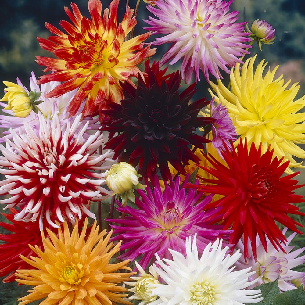 Однорічник. Висота рослини 130 см, діаметр квітки до 20 см. Яскраві махрові та напівмахрові квітки відразу привернуть увагу до цієї групи кактусовидних жоржин, язичкові квітки яких витончено згорнуті в трубочки, вигнуті і на кінцях загострені. Одночасно цвіте 10-15 кольорів.