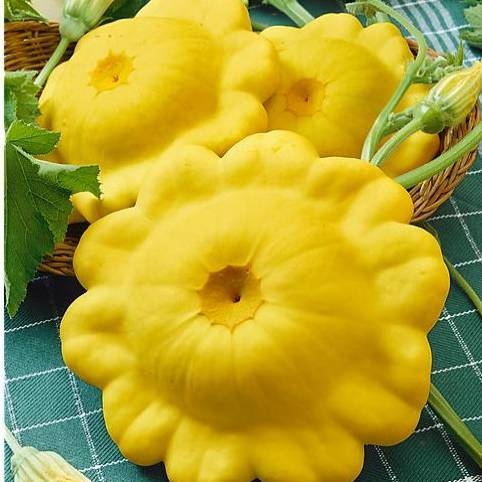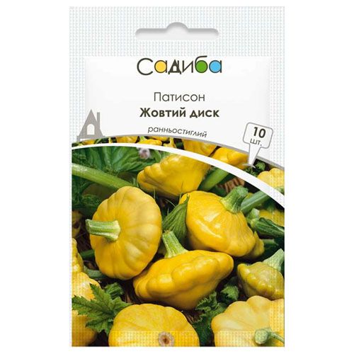 Патисон Жовтий диск - ранньостиглий (43-45 днів) делікатесний сорт для відкритого ґрунту. Потужний компактний кущик формує яскраві плоди діаметром 10-12 см, вагою 250-300 г, сонячного кольору з тонкою шкіркою і щільним твердим білим м’якушем, який відрізняється неперевершеними смаковими якостями. Врожайність до 6 кг/м2. Чудово смакує в будь-яких стравах, відмінно підходить для переробки – заморожування, соління й консервування, а також на овочеву ікру, адже не втрачає своїх властивостей і кольору.