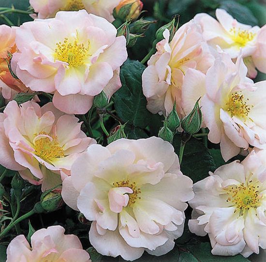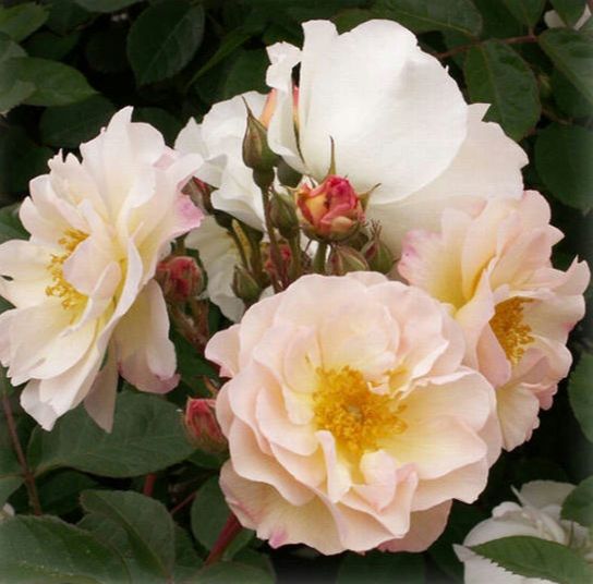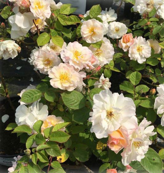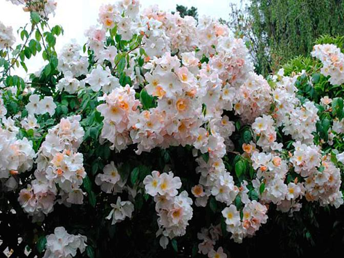 Pemberton Великобританія, 1924. Дуже красивий, округлої форми кущ, рясно цвіте шапками махрових квіток. Квітка кремово-рожева з жовтим відтінком і лимонним центром, при розпусканні світлішає, чашоподібна, махрова, 16-25 пелюсток, діаметром 6-8 см, має насичений мускусний аромат. Цвітіння багате, тривале. Кущ сильнорослий, заввишки 150-250см. Листя темно-зелене, маленьке напівглянсове. Сорт стійкий до захворювань, морозостійкий, виносить півтінь.