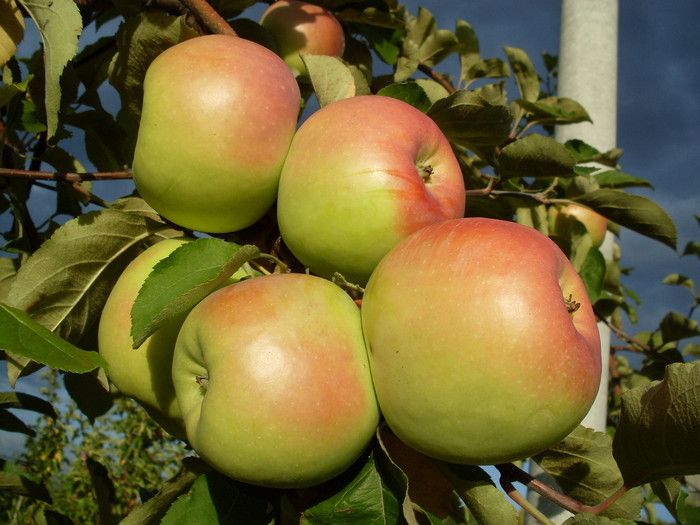 Плоди дуже ароматні, на смак солодкі, з виноградним присмаком, соковиті, мають пряний післясмак. Колірна гамма класична: яблука золотисто-зелені з ніжно-рожевим бочком. М'якоть світла, майже біла. Шкірочка досить тонка і дуже блискуча, що надає плоду особливий блиск. Дозрівають яблука в вересні-жовтні. Один плід може важити до 180 грам. Крона дерева овальної форми, зростання не дуже високий. Цвіте рано і досить рясно. Переваги сорту: яблука мають чудовий смак, що запам'ятовується дає дуже рясний урожай, відрізняється хорошою опірністю захворювань, плодоносить регулярно, стабільно добре, зберігається при відповідних умовах відмінно, переносить зимові морози.