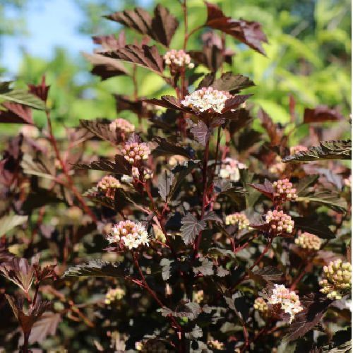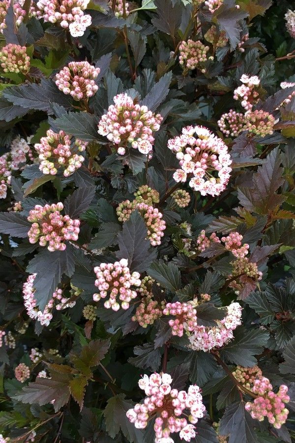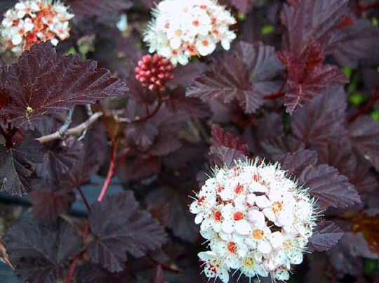 Маленькі рожево-білі квіточки зібрані в щитковидні суцвіття, мальовничо контрастують з вино-червоним листям.