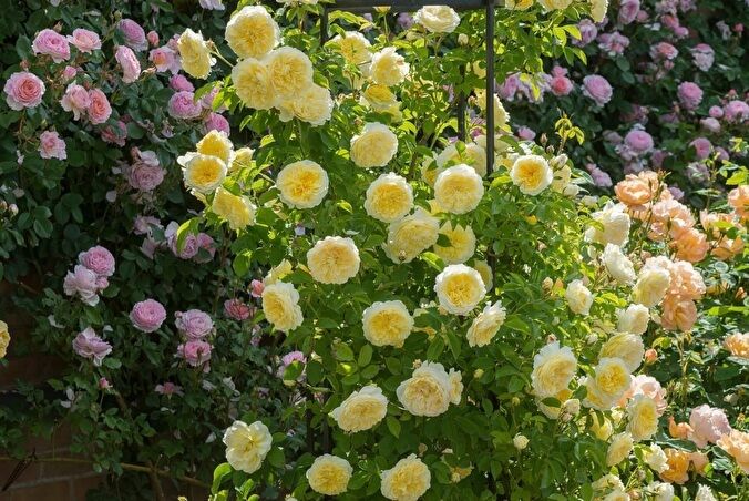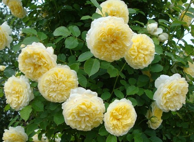 Квіти мають м'яку текстуру і красиву форму, складені з маленьких пелюсток, які створюють пласку квітку з насиченим жовтим кольором в центрі квітки, що поступово вигорає до вершково-жовтого відтінку. Квіти зібрані в кистях від 1 до 3 штук на одному стеблі діаметром від 8 до 10 см. Цвітіння довготривале, усе літо і осінь. Незважаючи на свої витончені квіти, ця троянда витривала. Світлолюбива, але виносить і півтінь. Широко використовується для вертикального озеленення альтанок і в штамбовій культурі. Аромат цієї троянди середньої інтенсивності.