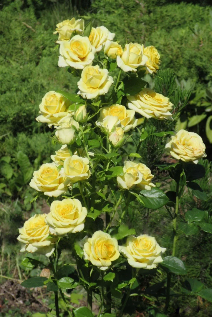 Величезні суцвіття, що складаються з невеликих квітках діаметром 5-6 см, вражають грою різних фарб. Розкриваючись квітки яскраво-жовтого кольору, в повному розпуск стають світло-вершкового, майже білого кольору. Кущ пишний висотою 40-60 см, густо вкритий середньо-зеленою, стійкою до хвороб листками. Патіо троянда Санрайз відмінно виглядає на низькорослих штамбових трояндах. Добре росте в вазонах. Морозостійкість висока.