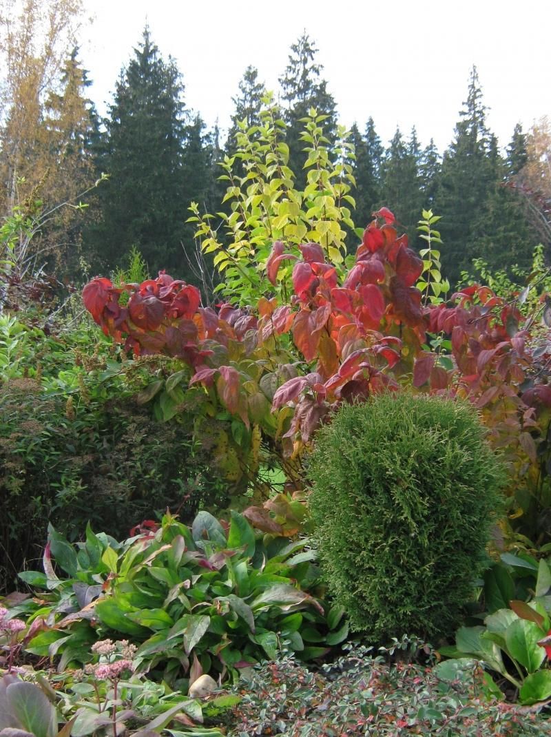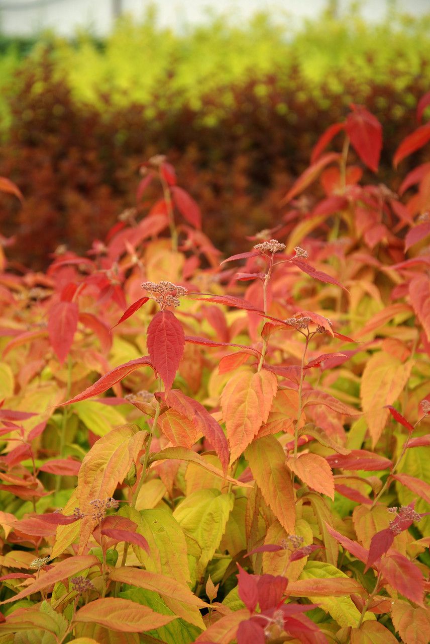 Листя до 15 см завдовжки, довгасто-яйцеподібні, зубчасті по краях, здуті, злегка зморшкуваті, молоді червоні, потім зеленіють, восени помаранчево-червоні. Листя на верхоцвітах червоного забарвлення весь період.
