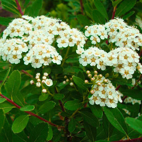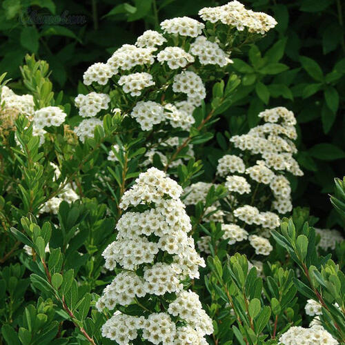 • Ширина: 2 метри Цвітіння: розташовані по всій довжині пагонів численні, білі, зібрані в щитовидні суцвіття. Час цвітіння: порадує своїм рясним цвітінням у червні.