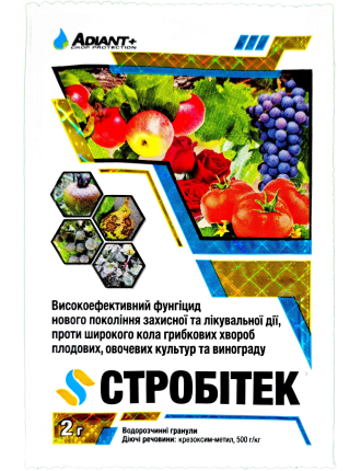 Стробітек - фунгіцид захисної, лікувальної та викорінюючої дії, високоефективний проти багатьох грибкових захворювань плодових культур та виноградників. Препарат володіє трансламінарною активністю, проявляє лікувальну та викорінюючу дію. Блокує проростання спор. Тривалість періоду захисної дії - 10-17 діб. Норма витрати Стробітеку - 0,2-0,3 кг/га.