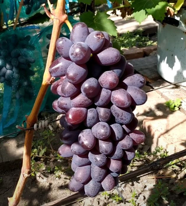 Кущ сильнорослий. Грона витягнутої форми, середньо щільні, пухкі, в середньому мають вагу не більше одного кілограма, окремі екземпляри досягають 1,5 кілограма. Ягідки мають овальну, злегка витягнуту форму, пофарбовані в гарний бордовий колір, м'ясисті, окрема виноградинка важить від 10 до 15 грам. Незважаючи на те, що грона щільні, як і самі ягоди – їхня м'якоть дуже ніжна, мармеладна.