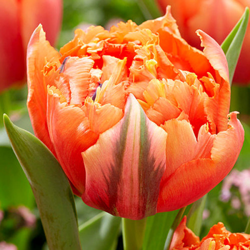 Махрові тюльпани на клумбі в саду виглядають елегантно і помітно одночасно. Сорт Роял Сентеніал привертає увагу насиченим помаранчевим забарвленням з червоними штрихами по всій поверхні пелюсток. Флористи показують, як красиво посадити тюльпани в саду, контейнерах, у бордюрів і такі композиції точно стануть родзинкою саду.