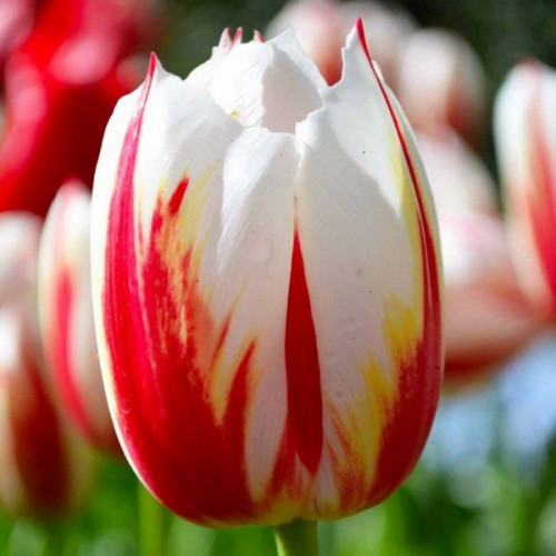 Білий тюльпан Тріумф Happy Generation (Щасливе покоління) з червоною смугою по центру стане яскравим акцентом в будь квіткової композиції, як на клумбі, так і в букеті. Щільна структура підтримує форму квітки весь період цвітіння, не даючи пелюсткам повністю розкритися.