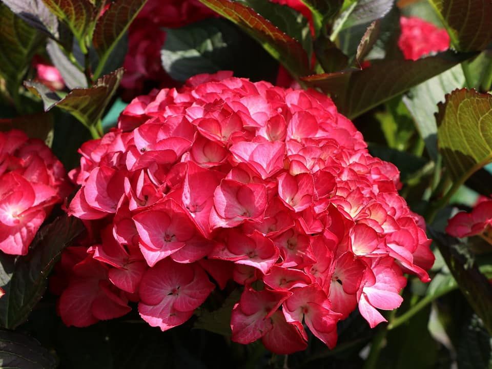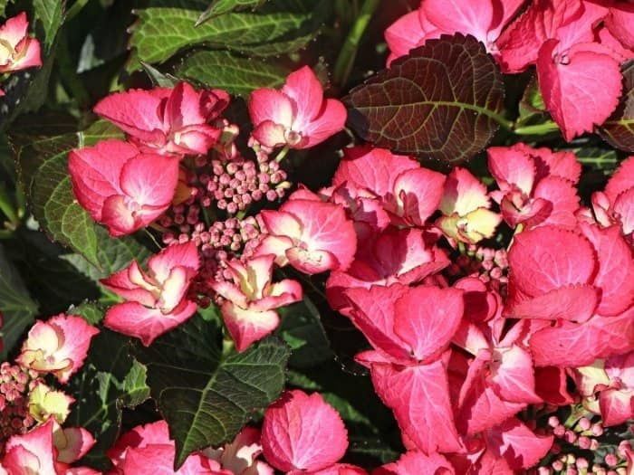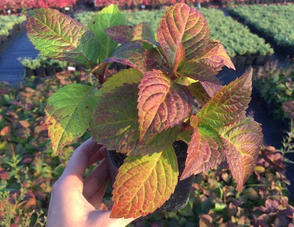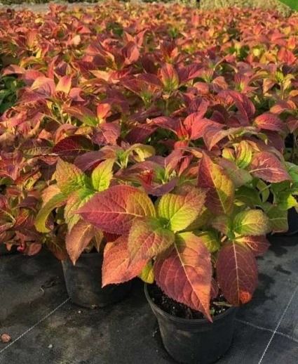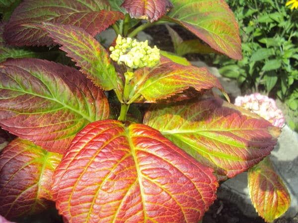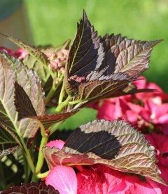 ГОРТЕНЗІЯ ЧЕРВОНОЛИСНА дуже цікавий вид гортензії крупнолисної з дуже темним листям темно-бордового кольору з чіткими прожилками. Форма листя подовжено-овальна з зубчастими краями. Цвітіння починається в червні і суцвіття мають форму півсфери, з великими квітками по краях і крихітними бутончиками в центрі, які зрідка відкриваються. Квіти мають фантастичну суміш кольорів - до краю світло-червоні, а центр жовтий, і за час дозрівання квітки він весь стає пурпуровим. Ростуть повільно, набуваючи форму акуратного кулястого чагарнику. Цвіте на торішніх пагонах, тому підрізати не можна.