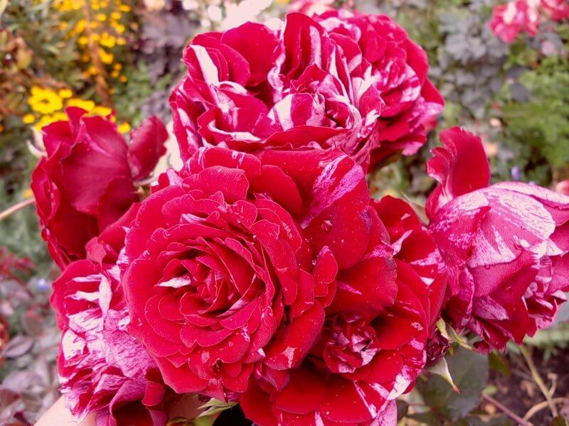 Троянда Діп Імпрешн - приваблива великими квітками до 8 сантиметрів в діаметрі, яскравим забарвленням махрових квіток. Сорт відноситься до групи флорибунда, але можна використовувати як бордюрну (спрей) троянду, кущі компактні. Виведений в Німеччина, Селекція Tantau. Квітки темно-червоного забарвлення, ближче до центру яскраво-рожеві, розбавлені світло-рожевими смужками і мазками. Цвітіння рясне і тривале, повторне, бутони зібрані в кисті 3-5 штук, присутній приємний слабо-виражений аромат. Кущ середньо-високий виростає висотою 60-80 см і ширина 50 см. Листя з не великим блиском. Стійкість до захворювань висока.