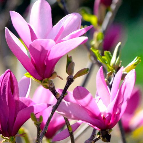 Магнолія гібридна Орхід дерево або чагарник, що досягає заввишки 4 м. Крона дуже гілляста, листя опадає на зиму. Листя велике темно-зелене, 20х10 см. Цвіте великими, до 11 см у діаметрі, лілієподібними квітками вузькобокаловидної форми. З легким геть вловимим ароматом, червоно-малинові зовні та білі або майже білі всередині. Рослина росте повільно із щорічним приростом від 15 до 20 см.