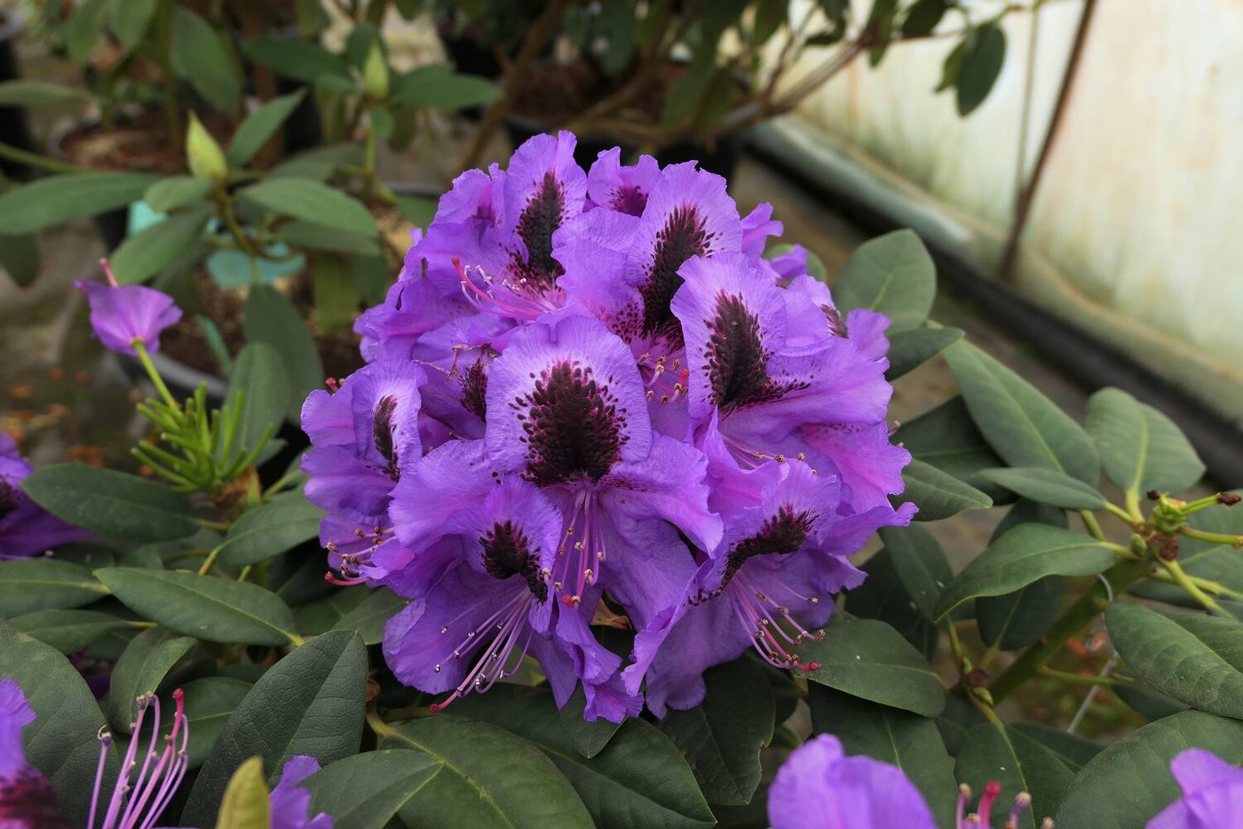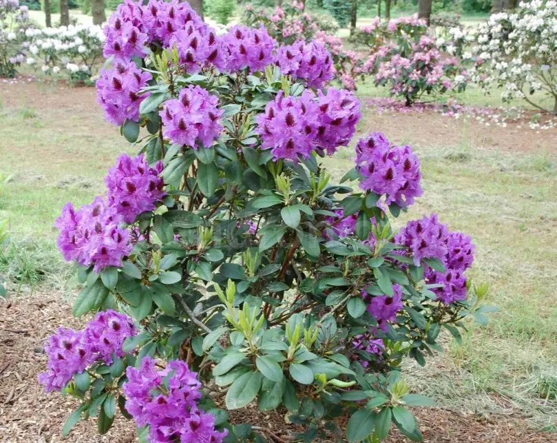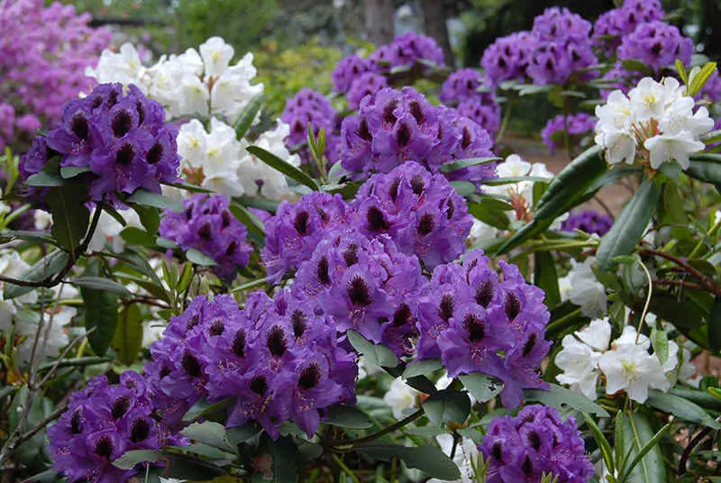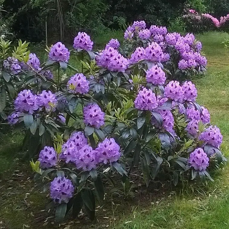 Рододендрон вічнозелений гібридний Peter Alan (Пітер Алан). Крупноквітковий. Неймовірно яскравий і ефектний сорт з широко відкритими фіолетовими квітками, з чорно-коричневими цятками на пелюстках. Суцвіття великі кулястої форми. Листя яйцеподібне, матове. Кущ щільний, що прямо росте із середньою силою росту. Висота 1,2-1,5 м у віці 10 років. Цвіте з кінця травня. Морозостійкість –26 °C. Використовується для груп, композицій із хвойними, одиночної посадки.